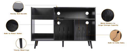 FeaturesClassical design turntable stands: This turntable stand with a record storage design with a power outlet built-in power center is a nice touch, vinyl record storage cabinet is convenient to provide power to your record player, stereo, DVD, phone charge station, and projector. Large storage record player storage holds plenty of albums up to 350's.